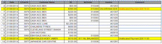 Ø S11 NIL BALANCES and UNCONFIRMED invoices number should not be allocated because they don’t have invoice number, only be received payment and put Unallocated Payments (date and time) to Comment column and highlight it in yellow.