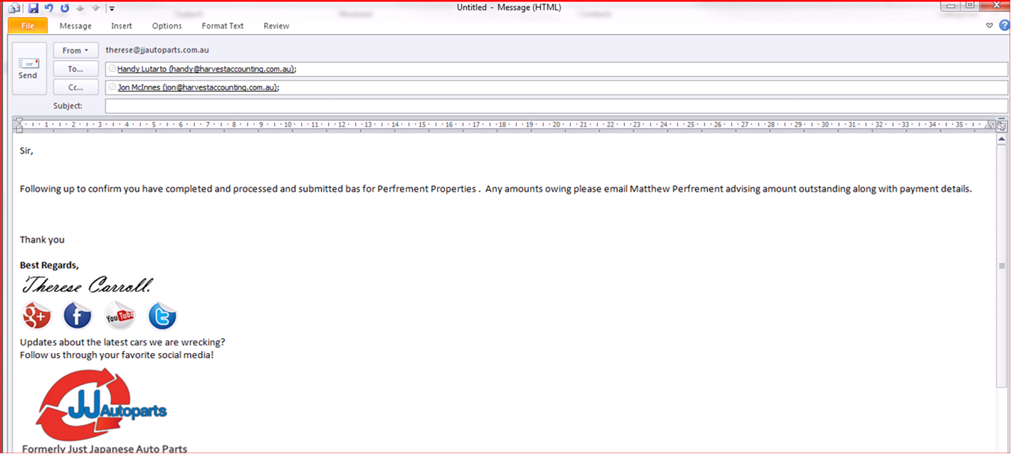This is an email we send to Matthew Perfrement Accountants as a reminder to complete process and submit BAS – Bas is due quarterly. Example email including email addresses below -