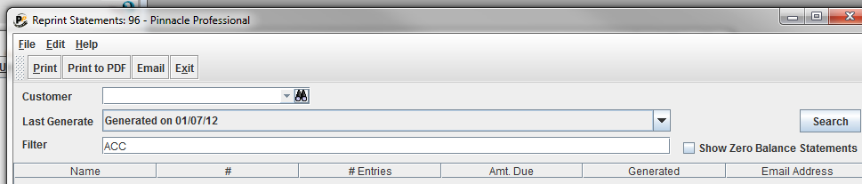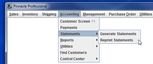 go to PINNACLE / ACCOUNTING / STATEMENTS / REPRINT STATEMENTS