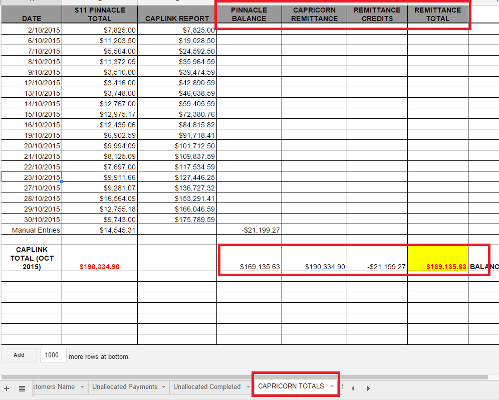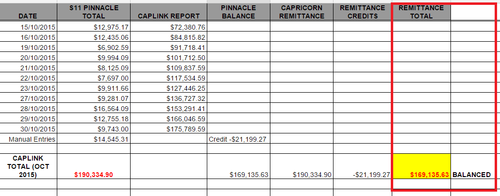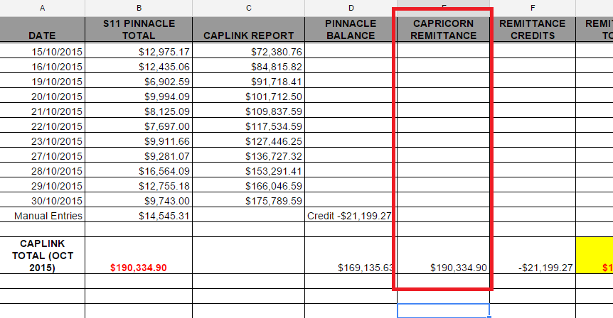 We need to enter the figures in columns for Pinnacle Balance – Capricorn Remittance – Remittance Credits - Remittance Total