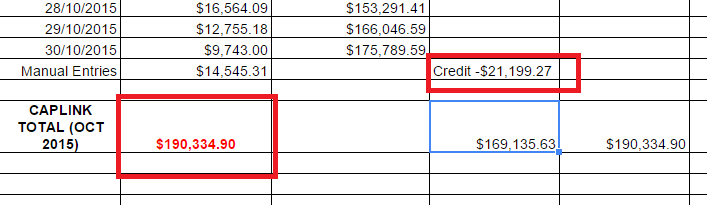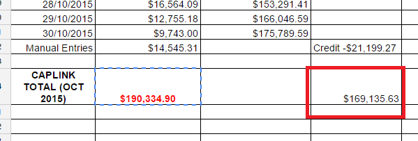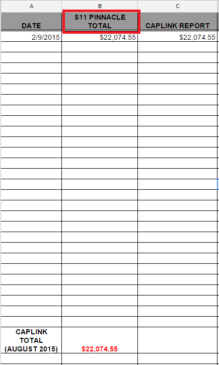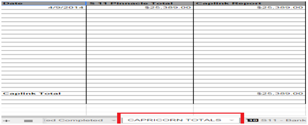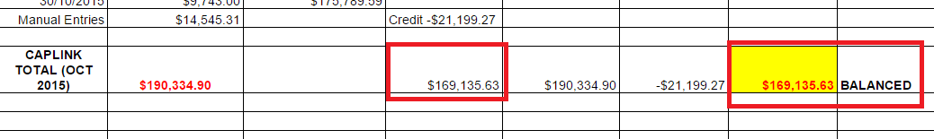 To get the total amount in Pinnacle Balance Column you have to get the sum of Caplink total for the previous month minus Credit amount