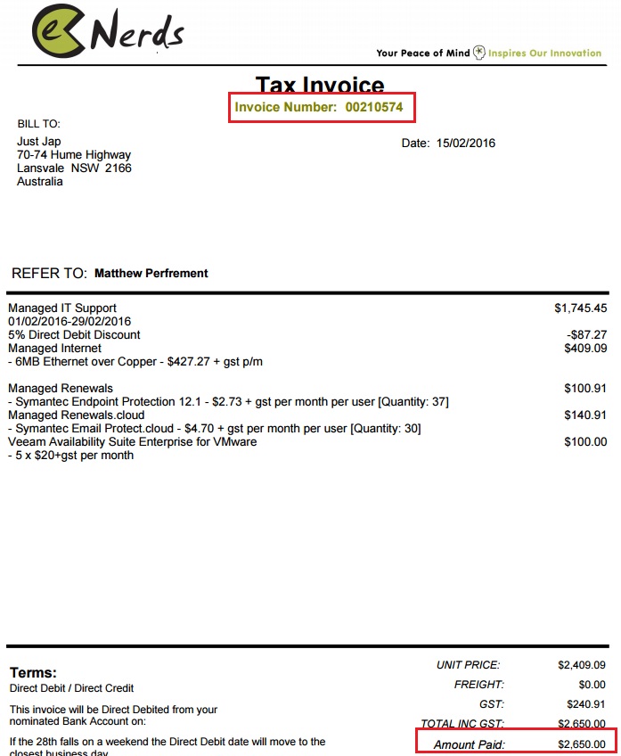 Our monthly service fee of $2650 is set up with DirectDebit.
