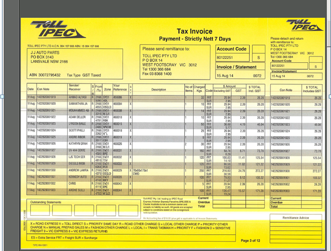 Column 2 - Record Con note number listed on freight invoice - ( this is only required if freight invoice has no JJAutoparts invoice reference number listed)