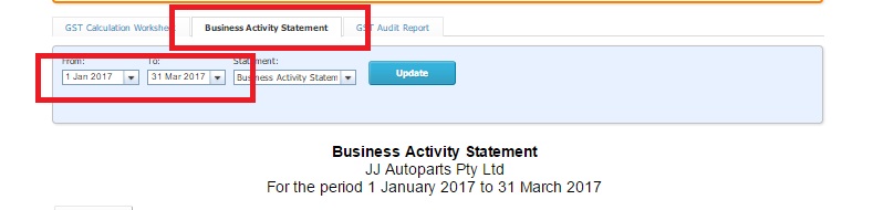 Go to Business Activity Statement tab, and make sure to enter correct dates for the quarter