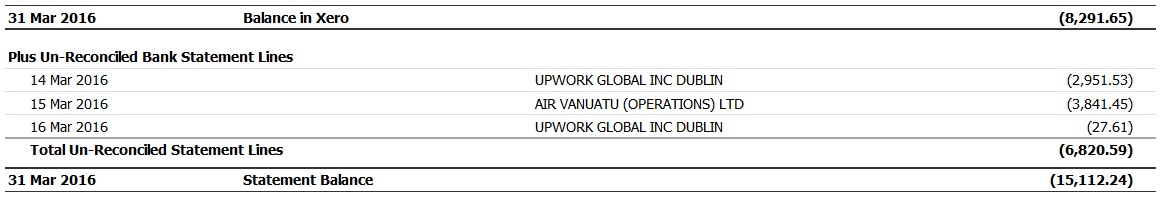 This shows all the quarter’s transactions – all debits & credits, transaction type, reference, GST tax rate, cheque numbers (entered in reference field), PO numbers (on Bills), descriptions. If there are multiple line items in an Invoice or Bill, then the description for each line item will display on individual rows.