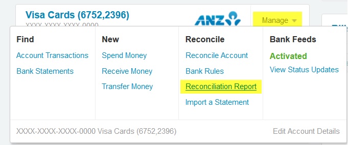 For each account you need to check that all transactions for the quarter have been reconciled. For Example: Preparing for BAS for the period of January – March. Click Manage > Reconciliation Report.