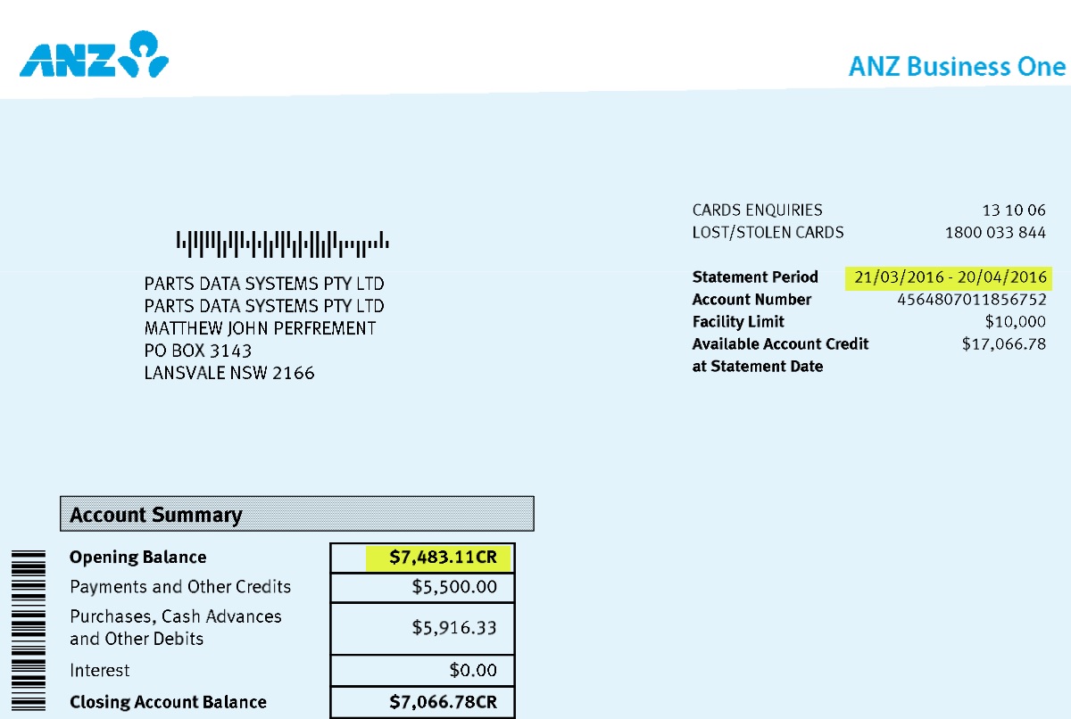 On the Bank Issued Statement of Account the period begins 21 March 2016 and ends 20 April 2016. We can see on the 21 March the Opening Balance was $7,483.11.