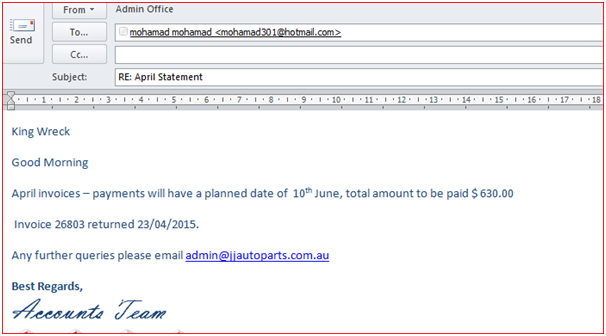 4. Email supplier advising variances between xero and supplier statement, advise supplier payment has been set for planned date………………… ( email address can be located in pinnacle, xero.
