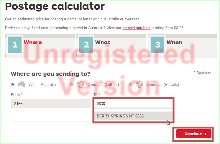 2. Go to the auspost postage calculator, ensure that "within Australia" is selected and enter "2166" in from and the customers postcode in the "to" field, select their suburb and click "continue"
