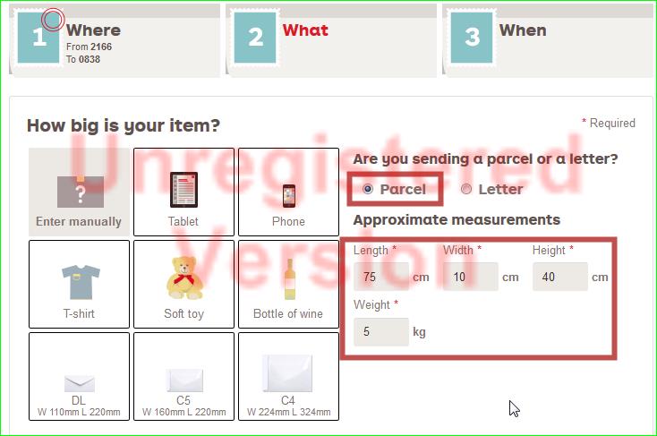 3. Select Parcel, and using the guide to dimensions we can enter in the estimated size and weight of the parcel, click continue