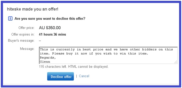 - Customer sent a very low offer. i.e. The item price is $1,000 and he only offer $10. Let's use 10% as our mark up. If the offer is lower than than 10% of the item price then we decline it straight away.
