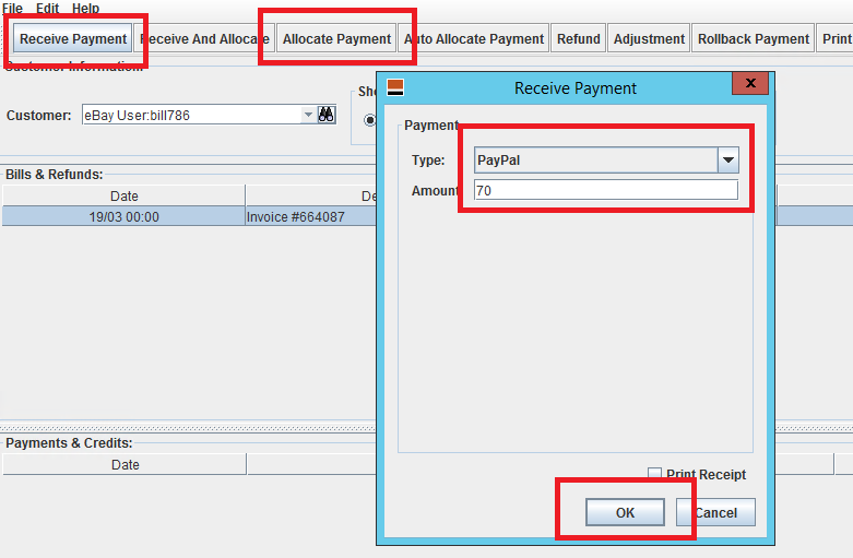 RECEIVE PAYMENT - PAYMENT TYPE - PAYMENT AMOUNT - SAVE - ALLOCATE PAYMENT