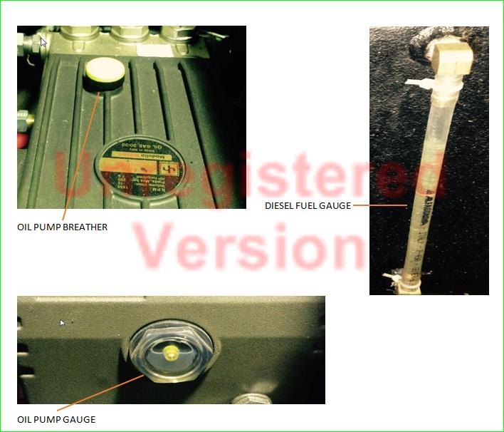 --CHECK WATER HOSE AND TAPE FITTINGS ONCE INSPECTION IS OK REPLACE DIESEL AND TURN WATER AND POWER ON BE SURE THAT STEAM CLEANER HAS A FULL TANK OF DIESEL AND THAT WATER PUMP OIL GAUGE IS READING ABOVE HALF WAY MARK ONCE THESE HAVE BEEN CHECKED PULL THE TRIGGER ON LANCE CHECK OIL PUMP GAUGE TO MAKE SURE THAT LEVELS HAVNT DROPED HOT WATER BURNER AND PUMP SHOULD BE WORKING GOOD